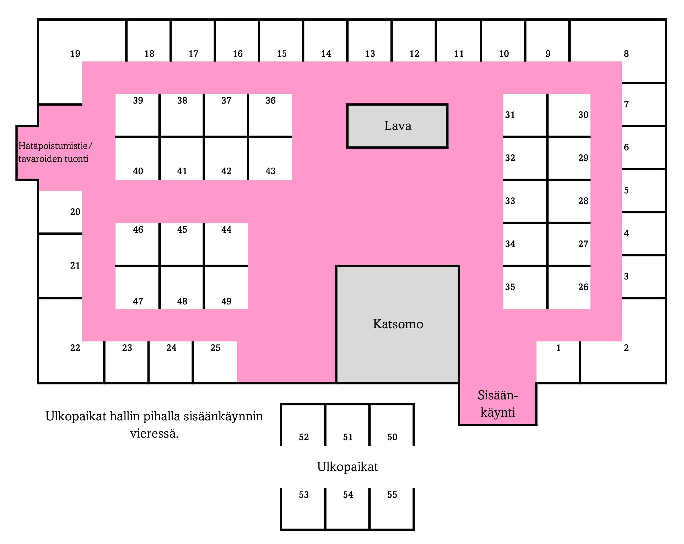 Myyntipaikat sisällä ovat kooltaan n. 2,4 x 2,4 metriä, ja sisältävät seinärakenteiden lisäksi kaksi pöytää (yhden pöydän koko n. 120 x 80 cm) ja kaksi tuolia. Mikäli et tarvitse osastolle varattuja pöytiä, järjestäjä siirtää ne varastoon. (Huom! Nurkkapaikat 9 ja 26 poikkeavat mitoiltaan muista.)